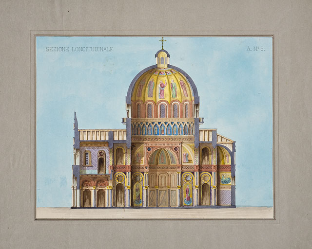 Entro passe-partout riquadrato, disegno ad acquerello, raffigurante la sezione longitudinale di una chiesa di rito orientale con le sue decorazioni.