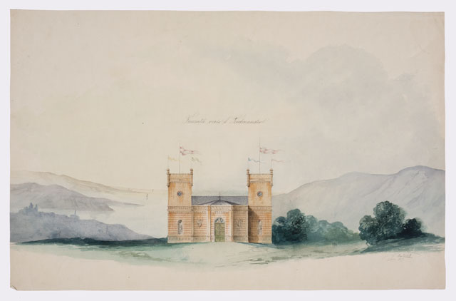 Disegno acquarellato raffigurante il prospetto di un edificio che domina un paesaggio con un golfo in lontananza. L'edificio, dal volume compatto, presenta due torri laterali che racchiudono un settore centrale lievemente avanzato, su cui si apre un portone ad arco. Fasce ornamentali con dettagli in pietra bianca segnano il basamento e la cimasa della parte aggettante; nicchie con statue e trofei di armi contribuiscono alla decorazione dell'edificio, trattato a conci lisci al piano terreno.