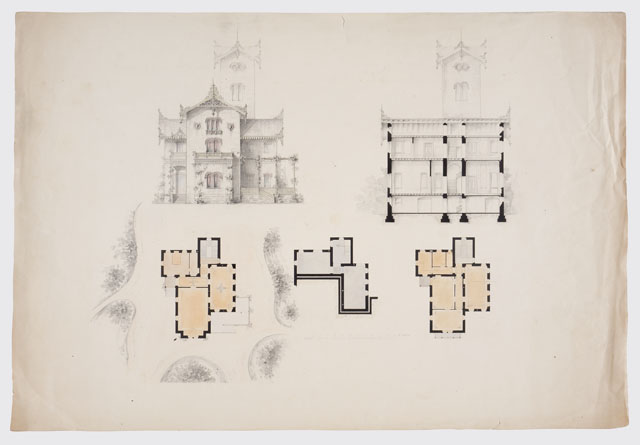 Si tratta di un progetto di villino, sviluppato anche in altre due tavole (cfr. CMSAOAR10_4141 e CMSAOAR10_4142), ove elementi di gusto Rundbogenstil sono accostati ecletticamente ad altri propri della casa rustica in legno. Acquistato per le civiche collezioni da Lituano Samero nel 1953, il disegno, sulla scorta di un'iscrizione vergata da mano ignota, è stato attribuito a Giovanni Andrea Berlam.