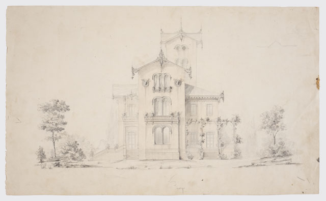 Si tratta di un progetto di villino, sviluppato anche in altre due tavole (cfr. CMSAOAR10_4140 e CMSAOAR10_4142), ove elementi di gusto Rundbogenstil sono accostati ecletticamente ad altri propri della casa rustica in legno. Acquistato per le civiche collezioni da Lituano Samero nel 1953, il disegno, sulla scorta di un'iscrizione vergata da mano ignota, è stato attribuito a Giovanni Andrea Berlam.
