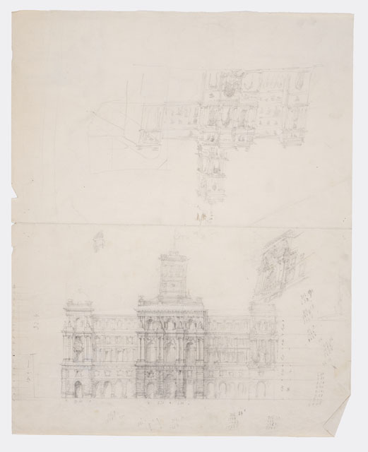 Schizzo a matita parzialmente quotato di un edificio a cinque livelli con corpi aggettanti, che lo definiscono lateramente, e al centro. Il piano terra e il mezzanino sono collegati da un partito murario a bugnato; un ordine gigante di colonne binate, sulla cui trabeazione vi sono gruppi scultorei, caratterizza i corpi sporgenti. L'avancorpo centrale presenta tre grandi finestre ad arco a tutto sesto; mentre il resto della facciata è traforato da finestre timpanate e architravate, rispettivamente al primo e secondo piano. L'ultimo piano, invece, presenta una doppia soluzione per le aperture: a tutto sesto, nella metà di sinistra dello schizzo, architravate, nella metà destra. In asse con l'avancorpo centrale, vi è una torretta con pennone per bandiera. Sul foglio, vi sono altri schizzi architettonici e calcoli matematici.