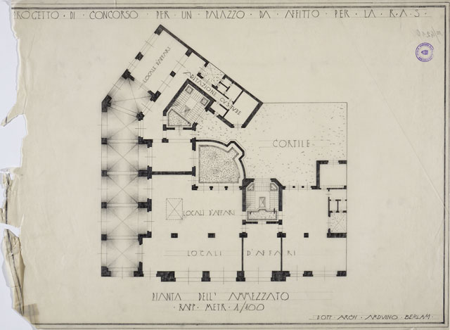 Il disegno in esame appartiene alla serie "Progetto di concorso per un palazzo di affitto per la Riunione Adriatica di Sicurtà, da costruirsi a Trieste in Piazza Oberdan", cfr. schede CMSAOAR10_4207-CMSAOAR10_4218, eseguito da Arduino Berlam. Il 3 febbraio 1934 Arnoldo Frigessi di Rattalma, presidente della Riunione Adriatica di Sicurtà, acquistò l’ultimo lotto disponibile nell’area di piazza Oberdan (pari a 1165 mq) per edificare un palazzo ad uso uffici e abitazioni di alto livello, con l’obbligo di rispettare i vincoli indicati nel piano di sistemazione dell’esedra Oberdan del 1925, per quanto riguardava le facciate e i portici. Lo stesso anno venne indetto un concorso ristretto, cui parteciparono Arduino Berlam, Gustavo Pulitzer-Finali e Umberto Nordio, che risultò vincitore (cfr. Krasovec in Nicoloso, Rovello 2005, pp. 177-179, n. 19).