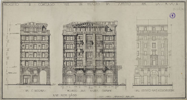 Disegno quotato a matita e inchiostro su carta, rappresentante i tre prospetti di un edificio a uso affitto: la facciata principale, ossia il prospetto su piazza Oberdan, e le due laterali. Il prospetto principale presenta un porticato al primo livello, che ingloba anche il piano ammezzato, con locali d'affari e, al di sopra, quattro piani e un attico. In corrispondenza della balaustrata, iscrizione relativa alla proprietà dell'edificio. Sull'attico è impostato un timpano. Il prospetto a sinistra e quello centrale presentano ombreggiature. Scala 1:100.