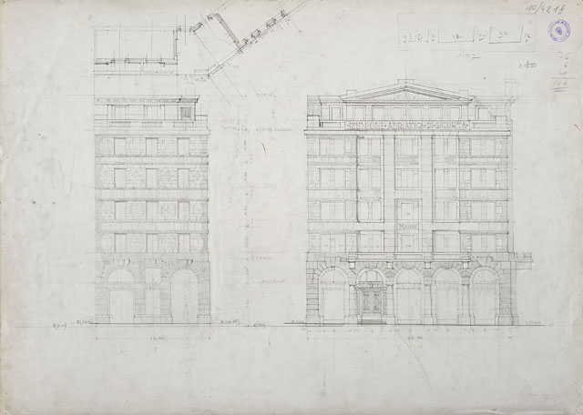 Il disegno in esame appartiene alla serie "Progetto di concorso per un palazzo di affitto per la Riunione Adriatica di Sicurtà, da costruirsi a Trieste in Piazza Oberdan", cfr. schede CMSAOAR10_4207-CMSAOAR10_4218, eseguito da Arduino Berlam. Il 3 febbraio 1934 Arnoldo Frigessi di Rattalma, presidente della Riunione Adriatica di Sicurtà, acquistò l’ultimo lotto disponibile nell’area di piazza Oberdan (pari a 1165 mq) per edificare un palazzo ad uso uffici e abitazioni di alto livello, con l’obbligo di rispettare i vincoli indicati nel piano di sistemazione dell’esedra Oberdan del 1925, per quanto riguardava le facciate e i portici. Lo stesso anno venne indetto un concorso ristretto, cui parteciparono Arduino Berlam, Gustavo Pulitzer-Finali e Umberto Nordio, che risultò vincitore (cfr. Krasovec in Nicoloso, Rovello 2005, pp. 177-179, n. 19).