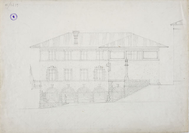 Disegno a matita; progetto per la facciata laterale di un edificio ad L, impostato su piano leggermente in pendenza. Consta di due piani elevati e di uno leggermente rialzato, che è definito da un portico con aperture ad arco.