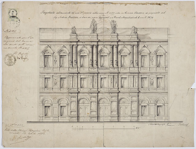 Si tratta di una delle quattro versioni della facciata di casa Ruzzier, sita già in Corsia Stadion 1157, ora via Battisti 17, Trieste, che si conservano presso i Civici Musei di Storia ed Arte (CMSAOAR10_4222-CMSAOAR10_4225). Insieme al primo progetto presentato alla Civica Ispezione Edile (Archivio Generale del Comune di Trieste, Archivio Pianificazione Urbana, prot. 2674 dd. 06.03.1872, ser. dis. 7369/0), questi disegni consentono di seguire l'elaborazione del prospetto dell'edificio da parte dell’architetto Giovanni Andrea Berlam. Essi variano infatti nel numero e nelle dimensioni dei piani, da uno a tre, e nell'apparato decorativo. Il disegno in esame costituirà il prototipo del progetto approvato, ma i due gruppi scultorei presenti al centro del coronamento saranno sostituiti da una lunetta, sormontata da una figura di Mercurio, come sembrano suggerire alcuni lievi tratti a matita. Come rilevato dalla critica, nell'apparato decorativo (finestre con lunetta, cimiero, cimasa) Berlam si rifà al linguaggio architettonico di Marco Coducci; anche se la cornice e la balconata centrale rinviino a un rinascimento più maturo (Lettis 1993, p. 61). L’edificio fu commissionato dalla moglie di un panificatore, che, secondo Pozzetto (1999, pp. 66-67), doveva essere un fornitore dell’esercito e/o della marina. Qualche anno dopo, per la stessa committenza, Berlam eseguì il prolungamento dell’edificio, con affaccio in viale XX Settembre, che venne demolito nei tardi anni cinquanta del Novecento.