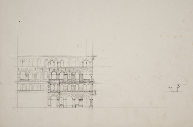 Il disegno è da riferirsi alla progettazione di Casa Leitenburg, cfr. CMSAOAR10_4226-CMSAOAR10_4232. Progettato nel 1887 da Ruggero Berlam per Edoardo de Leitenburg, l’edificio è considerato un capolavoro dell’architetto triestino. Per le notizie storico-critiche dell’edificio, si rinvia alla scheda CMSAOAR10_4226. Si tratta di uno schizzo per la facciata prospiciente via Giulia, in cui l’attenzione dell’architetto è focalizzata su un corpo centrale leggermente aggettante, come indicano le ombreggiature, che interessa l’edificio dal piano terra al secondo livello, in cui si aprono rispettivamente l’ingresso principale e un terrazzino, con sculture alle estremità della balaustrata.