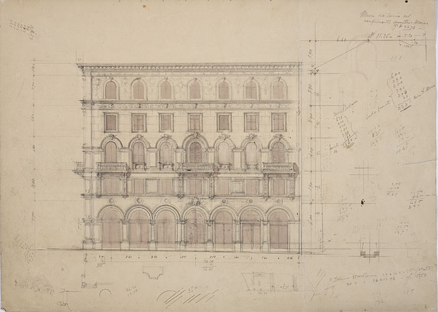 Disegno quotato a matita, penna e acquerello, raffigurante prospetto di edificio a cinque livelli. Tutt'attorno schizzi di dettagli architettonici e calcoli numerici. Sul verso, schizzo per una facciata.