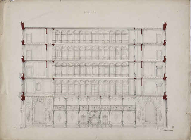 Si tratta di uno dei progetti per Casa Kosler (cfr. CMSAOAR10_4240-CMSAOAR10_4244), café chantant, realizzato in corso Italia a Trieste da Giovanni Andrea Berlam nel 1863 e demolito negli anni Trenta del XX secolo. Dal disegno in esame, si osserva che il piano terra, a pianta libera, con serie di colonnine in ghisa che reggono i piani superiori, è destinato ai tavolini e, in minima parte, ai servizi e all'ingresso. Ai piani superiori, gli spazi sono adibiti, come recitano le iscrizioni entro la lunetta delle porte ad arco, a "cucina"; "sonaglio"; "cessi"; "cameriere"; "bagno"; "telegrafo"; "scala"; "servizio". Le pareti e le balconate sono immaginate riccamente decorate con sculture, specchi, tendaggi e rilievi.