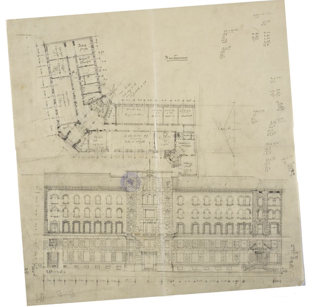 Disegno quotato a matita su carta, raffigurante, nella parte superiore del foglio, la planimetria del pianterreno di un edificio per l'Istituto Nazionale d'Assicurazione per gli Infortuni sul Lavoro; nella parte inferiore, il prospetto dello stesso. Nella planimetria, studio della distribuzione dell'edificio con definizione della destinazione d'uso (scritte all'interno dei locali). Calcoli matematici occupano la parte destra del foglio.