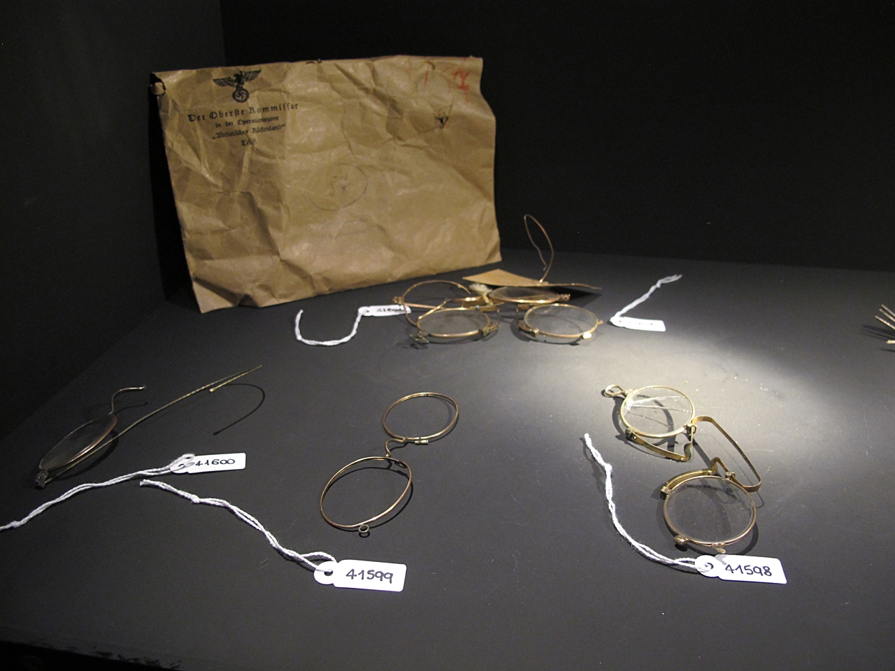 Si tratta di una serie di oggetti personali razziati dai nazisti. Ritrovati dagli alleati all’interno di sacchi di juta, furono spediti a Roma, dove per decenni rimasero presso il ministero del Tesoro. Recuperati nel 1997, nel 2000 vennero restituiti alla Comunità ebraica di Trieste, che decise di esporne una parte nel Museo Ebraico della città intitolato a "Carlo e Vera Wagner" e di donarne una selezione al Civico Museo della Risiera di San Sabba e al museo Yad Vashem di Gerusalemme. L'occhiale ha un'etichetta in carta con dei numeri apposti, si tratta della stima attribuita dai nazisti agli oggetti.