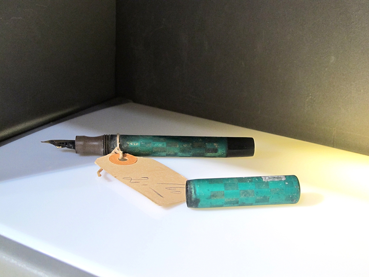 La penna fa parte del nucleo di oggetti razziati dai nazisti dalle case degli ebrei triestini. Presenta il fusto e il cappuccio di colore verde con una decorazione geometrica a rettangoli. Il cappuccio ha una parte rovinata, potrebbe trattarsi del punto in cui era posto il fermaglio (che non è presente). Il pennino potrebbe essere di tipo italico.