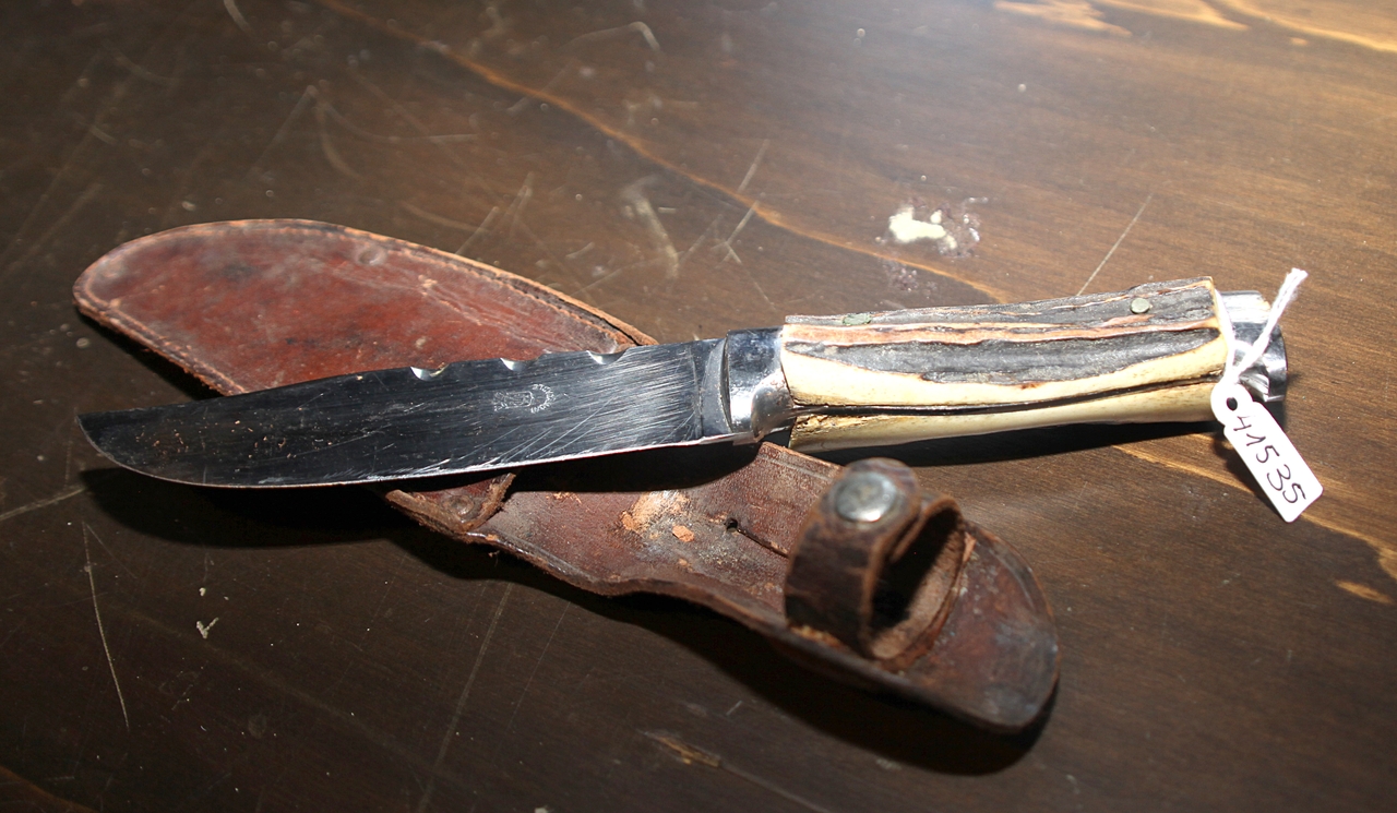 Si tratta di un coltello con manico di osso e lama in metallo, munito di fodero in pelle.