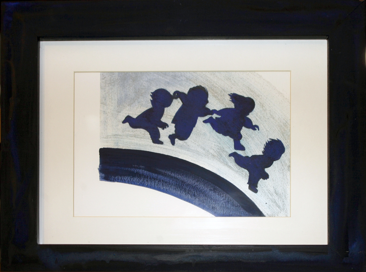 Quattro bambini resi con una sagoma blu corrono e saltano sospesi sopra un arco blu intenso, lo sfondo è di un azzurro grigiastro.
