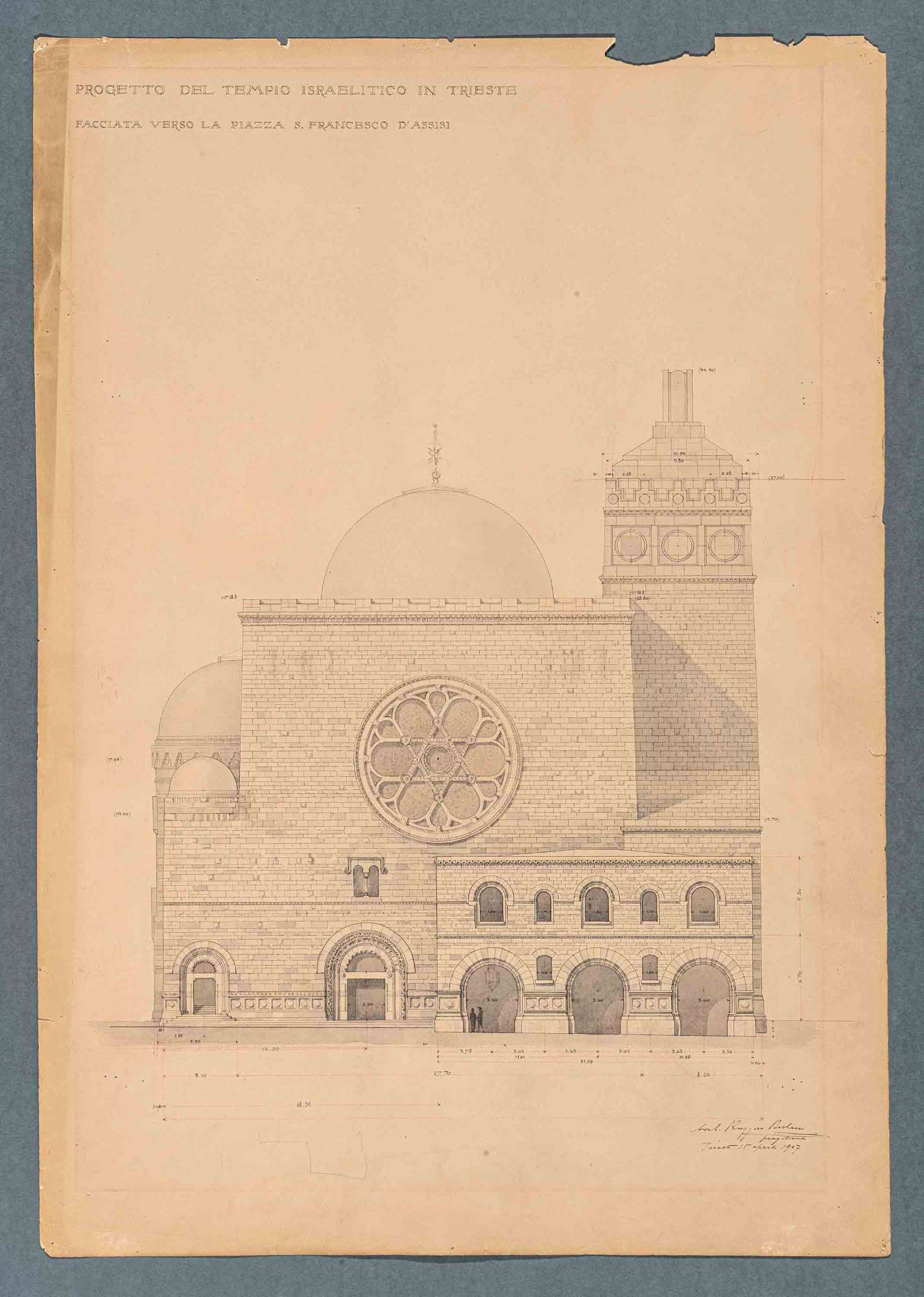Tavola progettuale per la Sinagoga di Trieste raffigurante la facciata dell'edificio verso la piazza San Francesco d'Assisi.
