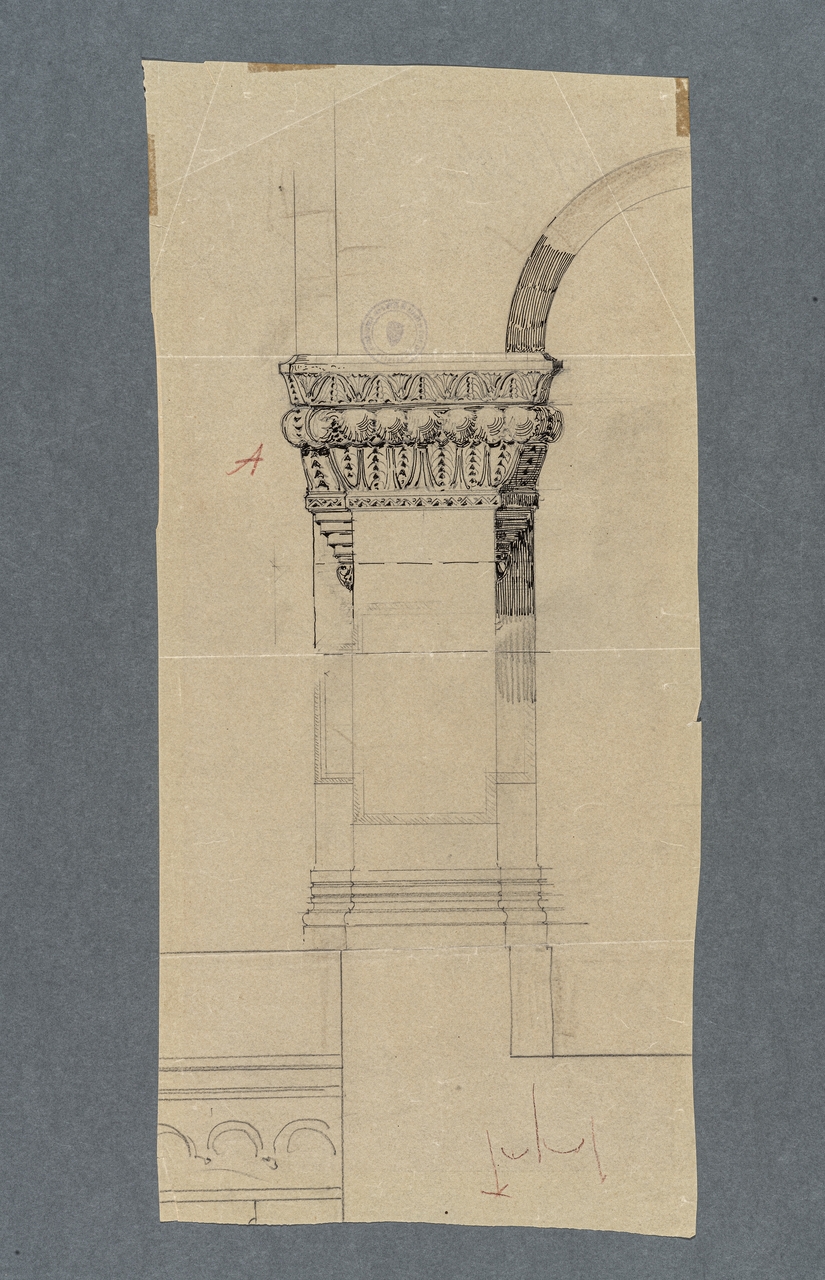 Tavola progettuale per la Sinagoga di Trieste, raffigurante il particolare di una lesena con capitello nella parte posteriore dell'edificio.