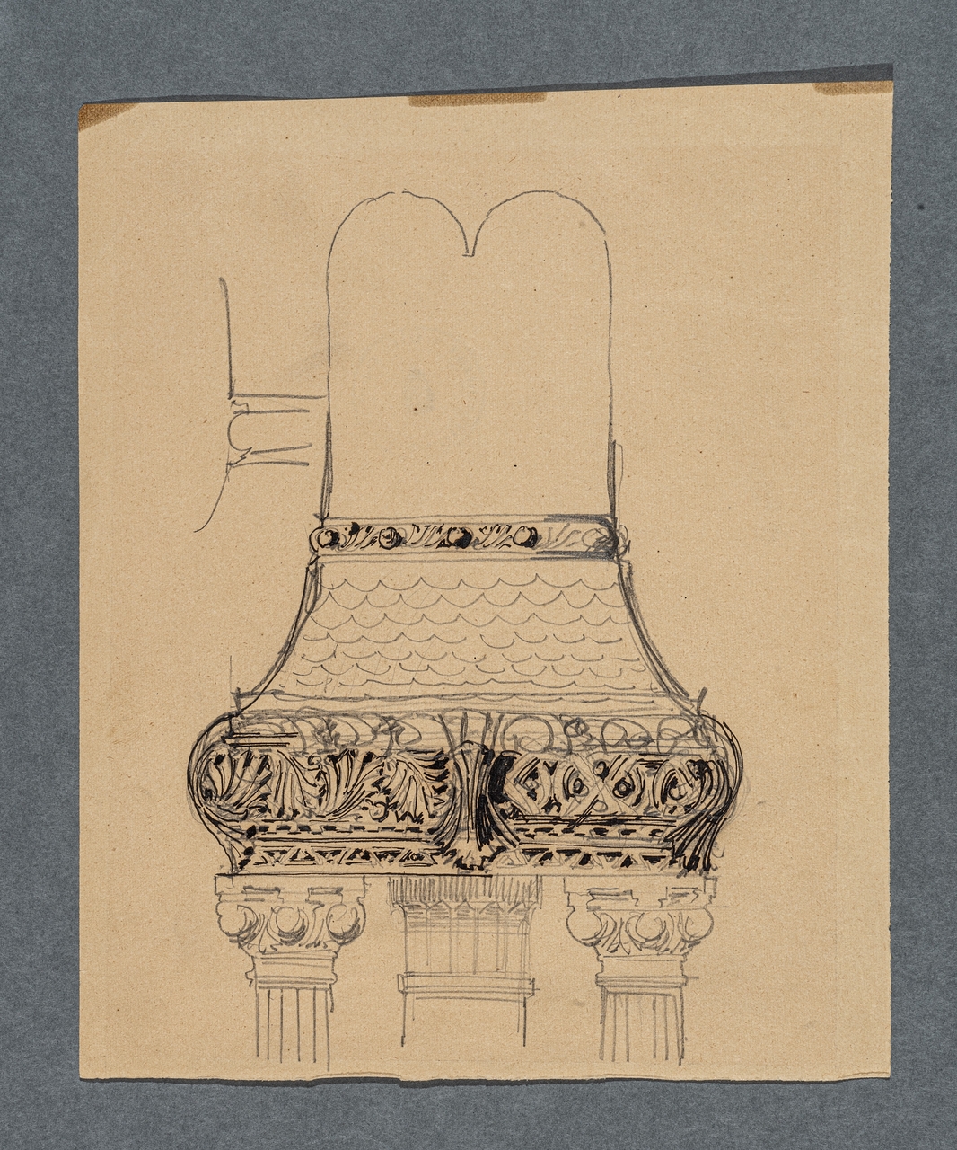 Il foglio presenta uno schizzo con un particolare dell'Armadio Sacro della Sinagoga di Trieste.