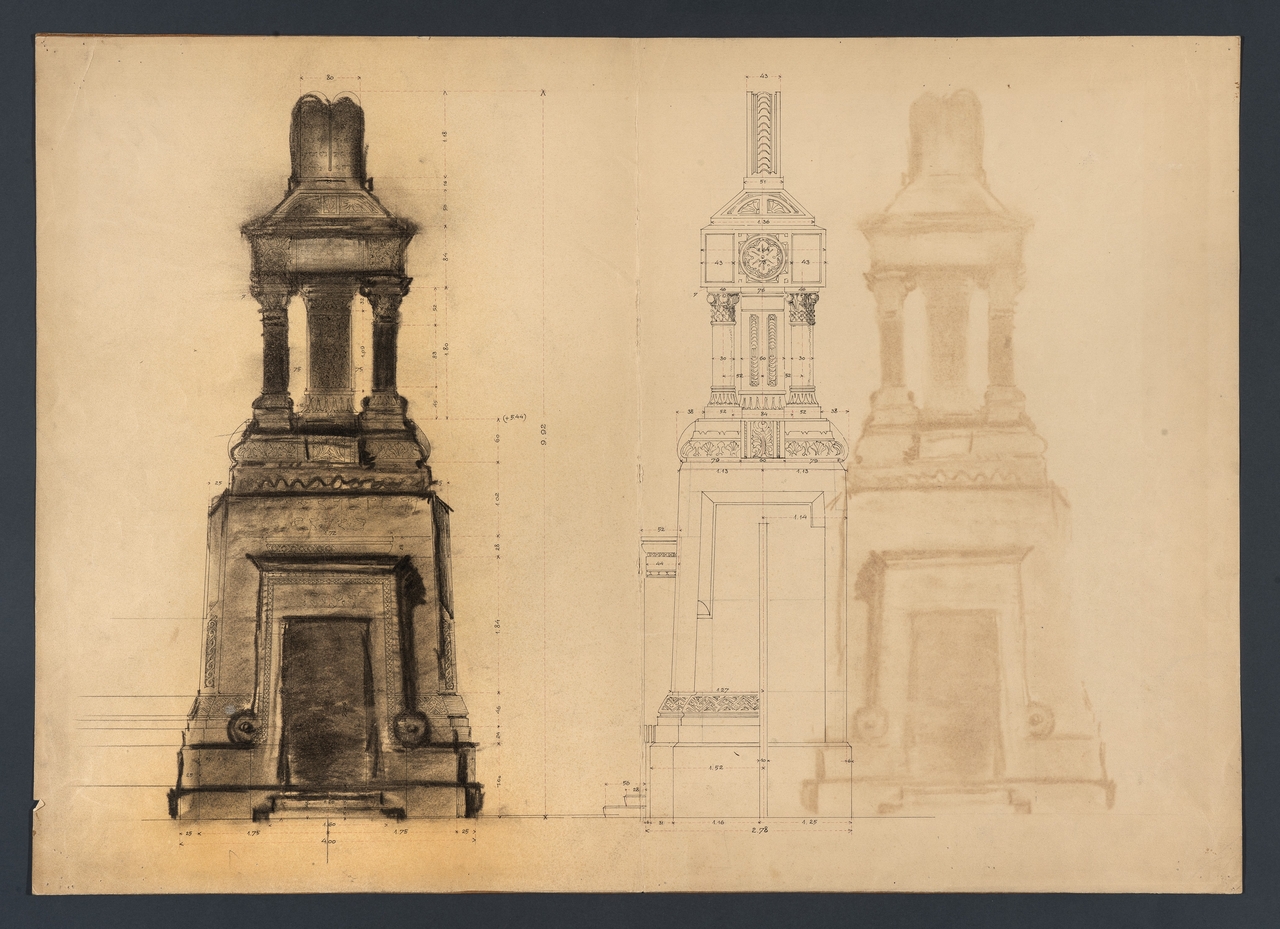 Il disegno rappresenta l'Armadio Sacro della Sinagoga di Trieste: si tratta di due visioni, frontale e laterale, con misure.