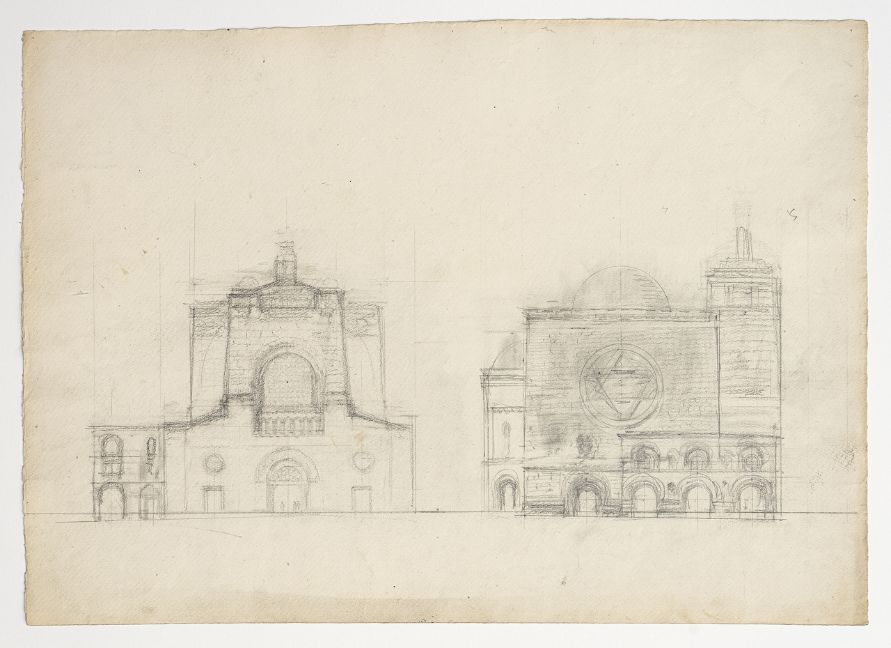 Tavola progettuale per la Sinagoga di Trieste, raffigurante la facciata principale e quella laterale.