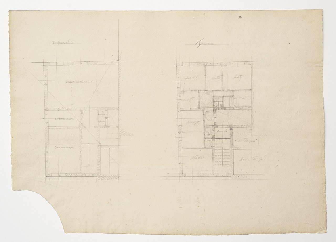 Il disegno rappresenta le piante del primo piano della Sinagoga di Trieste, con l'indicazione della cancelleria della sala sedute, del salotto e di altri ambienti.