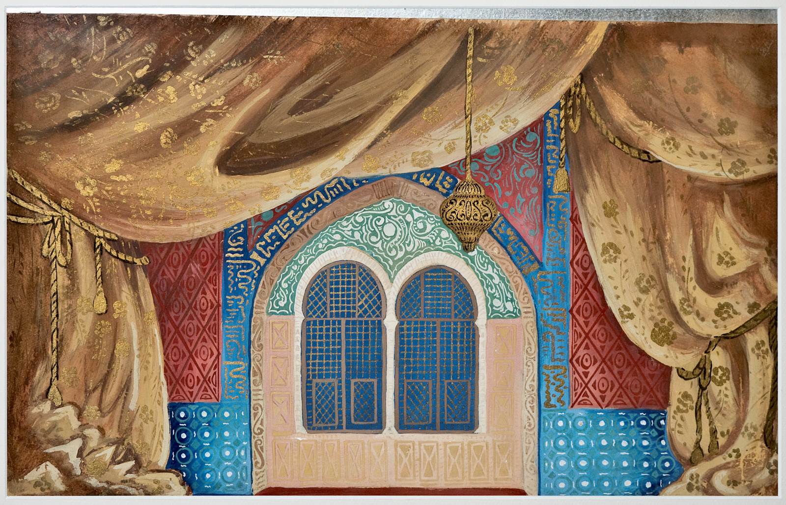 II ratto dal serraglio di Wolfgang Amadeus Mozart. Sala interna di un palazzo moresco con copertura di tendaggi fioriti su sfondo policromatico a mattonelle geometriche ornamentali con iscrizioni in caratteri arabi, nicchia con bifora e graticciata lignea
