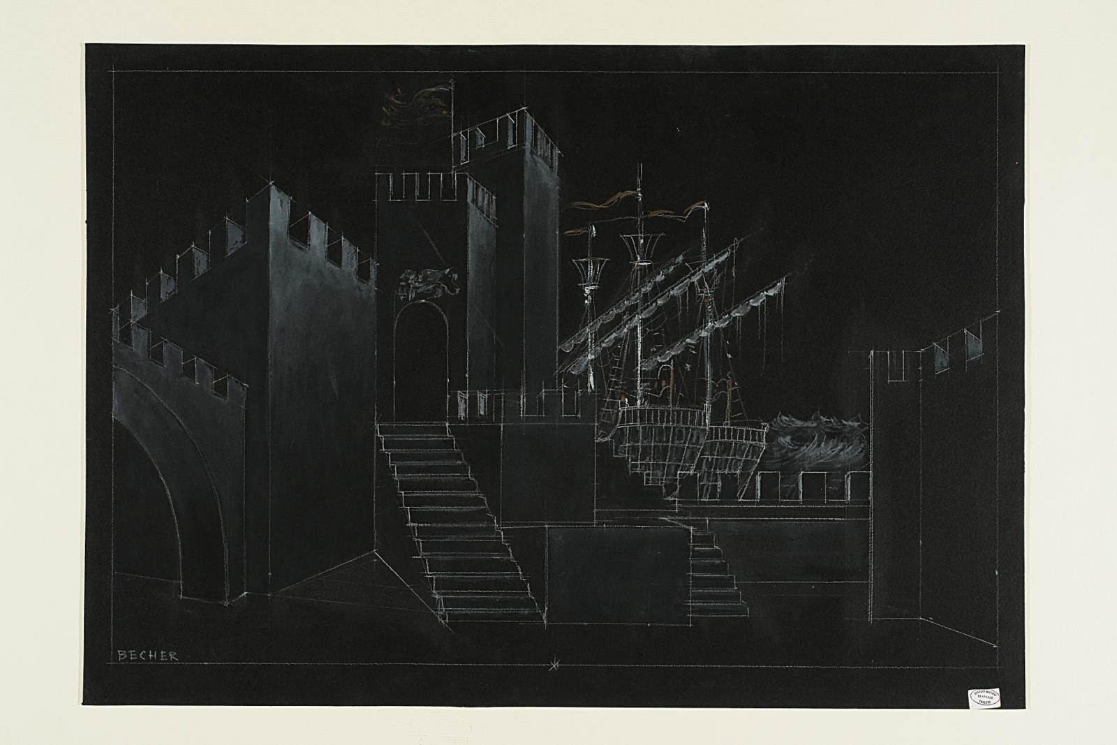 Otello di Giuseppe Verdi, bozzetto scenografico, atto 1. Castello merlato a Cipro con torri e due velieri sullo sfondo