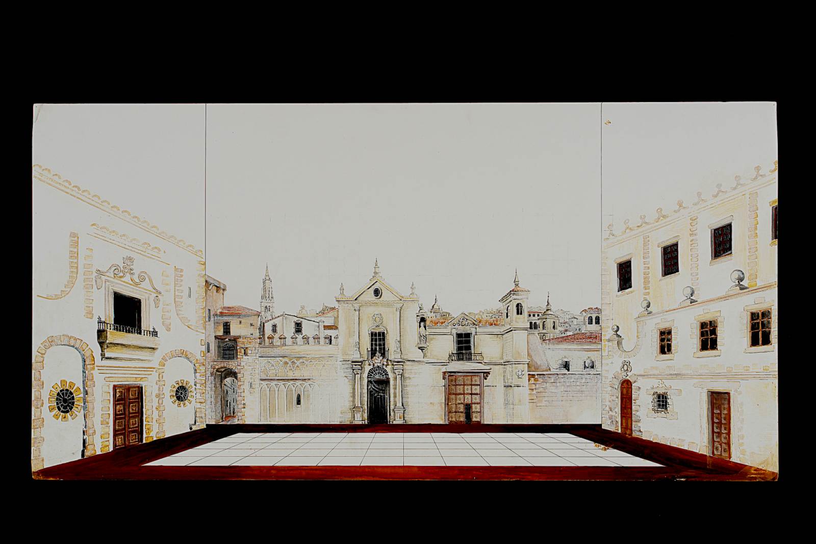 Il cordovano, atto unico di Goffredo Petrassi. Piazza lastricata, sullo sfondo facciate di palazzi con decori seicenteschi spagnoli