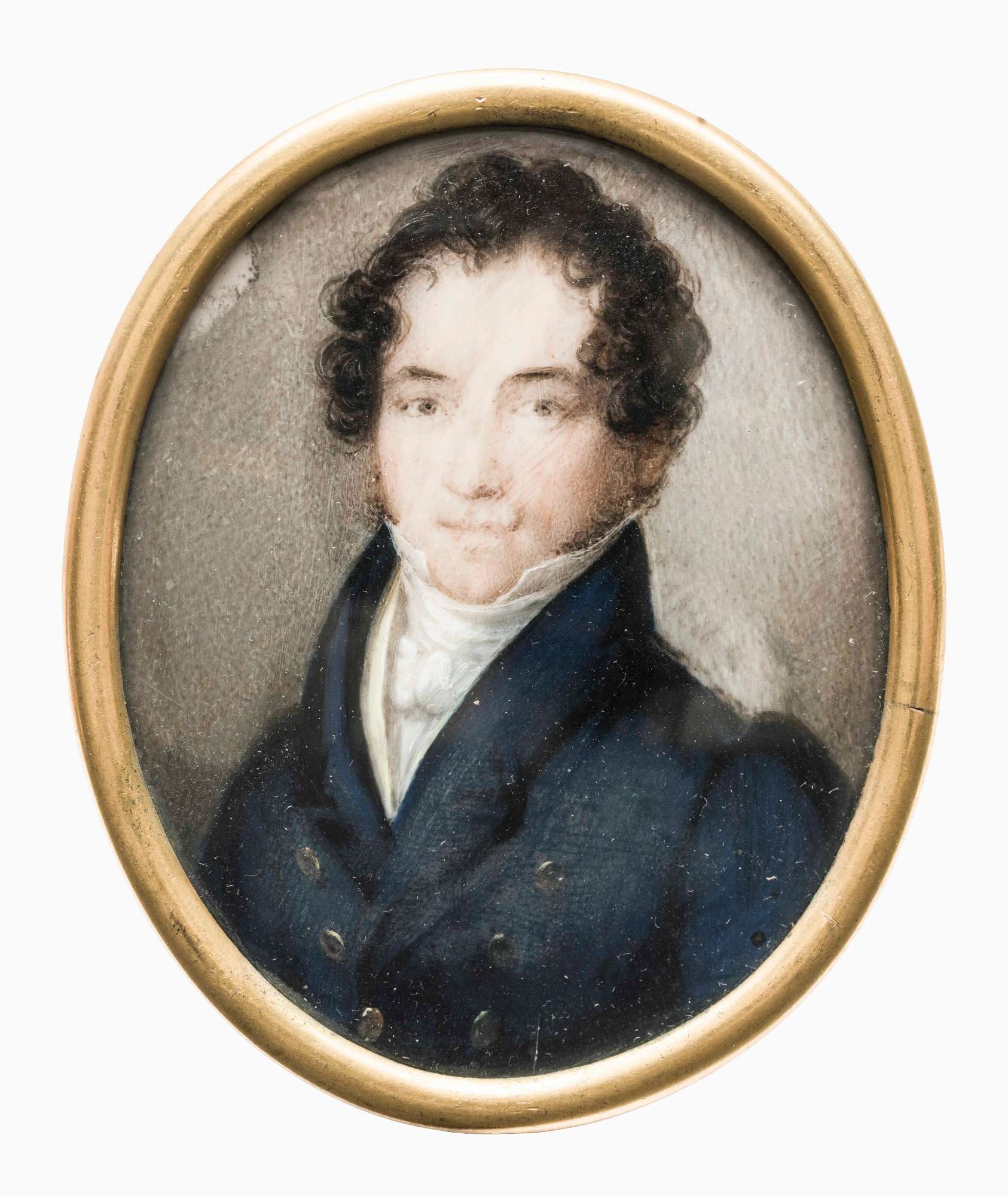Ritratto in miniatura verosimilmente pervenuto attraverso il legato Sartorio nel 1947, cfr. Ritratti a Trieste 1993, p. 11. L’uomo è ritratto con una marsina blu su un panciotto giallo, camicia bianca a collo alto e cravatta anch'essa bianca. Corti riccioli incorniciano il volto, secondo la moda “alla Brutus”, diffusa tra i due secoli. Il fondo grigio è sfumato a tratteggio. Seppur difficilmente giudicabile per il mediocre stato di conservazione, il naturalismo con cui è realizzato il volto colloca la miniatura in ambito italiano verosimilmente entro il primo quarto del XIX secolo.