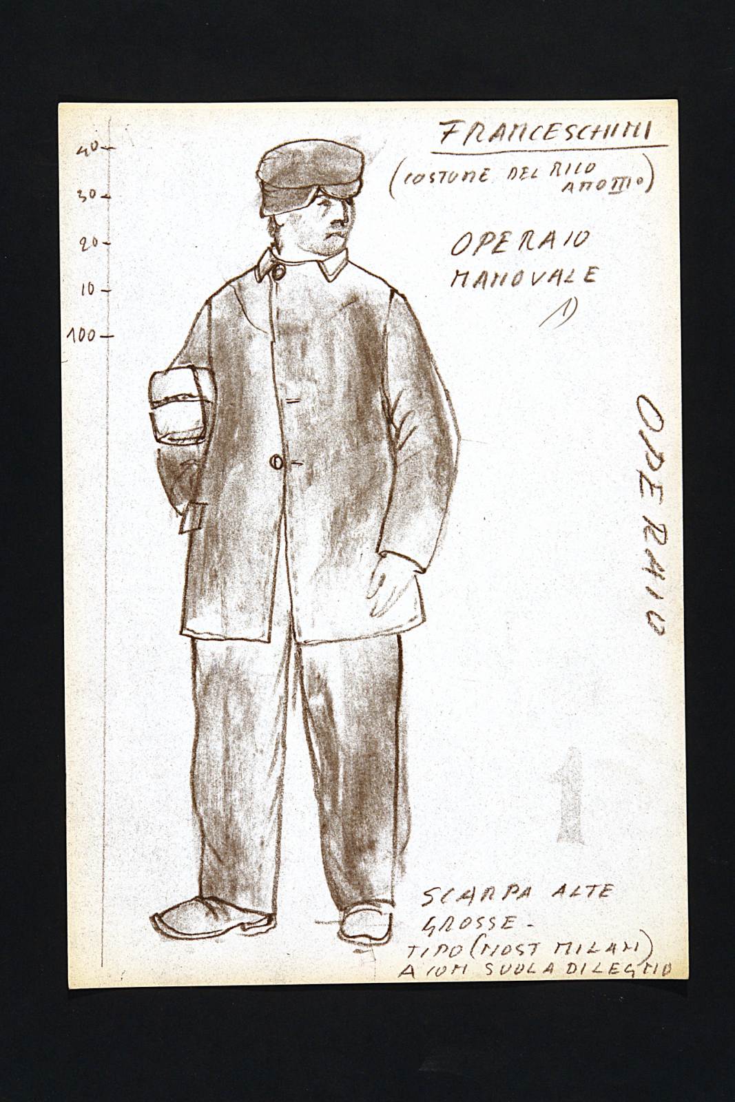 Motivo di scandalo e di riflessione, due tempi di John Osborne. Figura maschile intera con cappello, giacca da lavoro e calzoni.