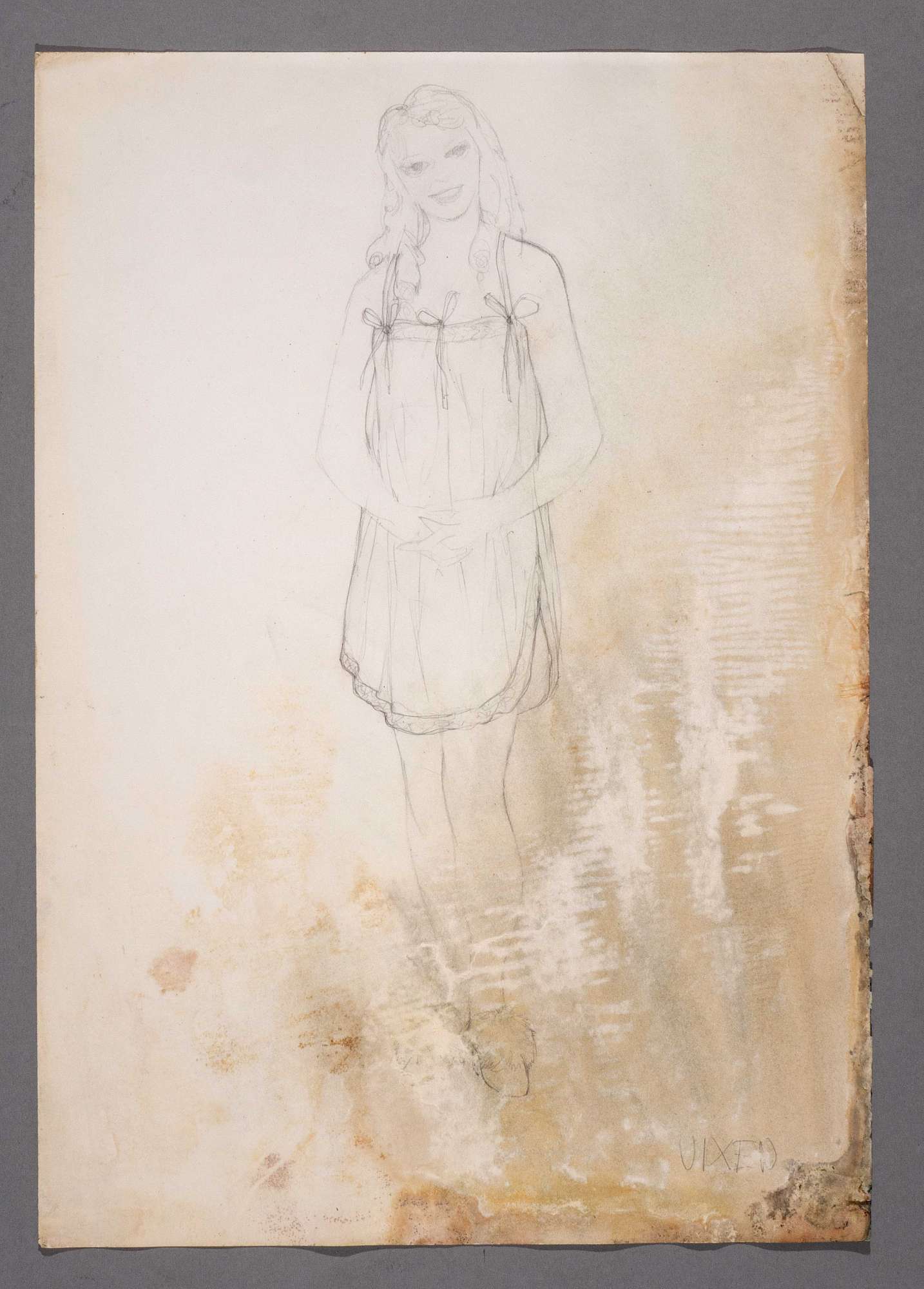 L'opera da tre soldi, di Bertolt Brecht e Kurt Weill, regia di Giorgio Strehler. Figurino di figura femminile sorridente in biancheria intima, corta sottoveste scollata dalle linee morbide, con fiocchi alle spalline e al centro della scollatura, a capo scoperto e capelli sciolti, calzature con piume