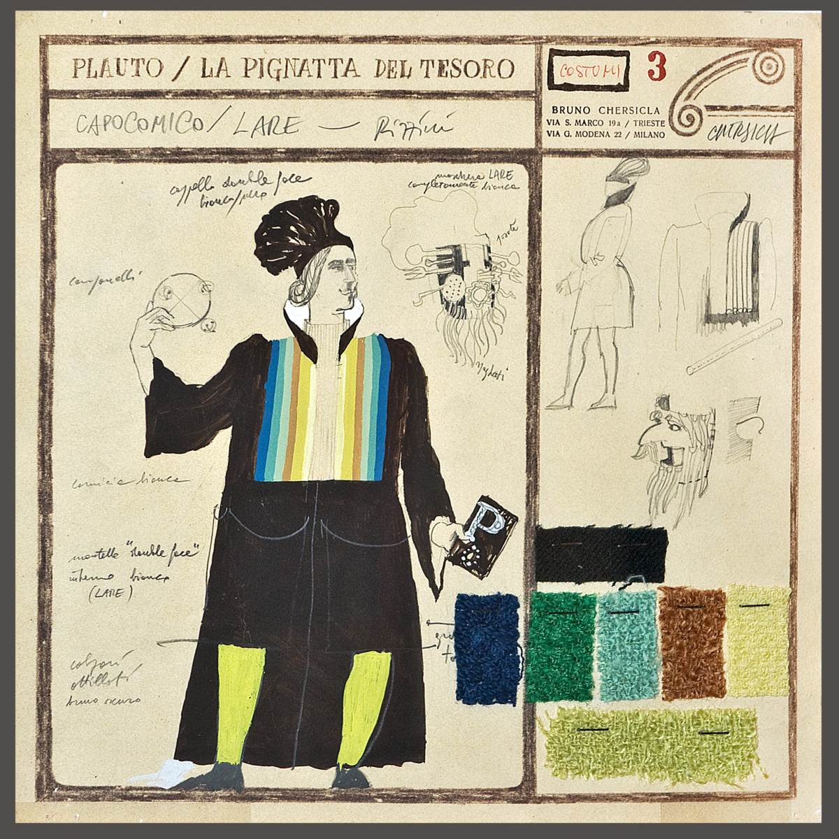 Figurino per Aulularia (La pignatta), testo teatrale di Tito Maccio Plauto (elaborazione di Lino Carpinteri e Mariano Faraguna), regia Ugo Amodeo, Teatro Auditorium e Teatro Romano dal 1 al 28 giugno 1966