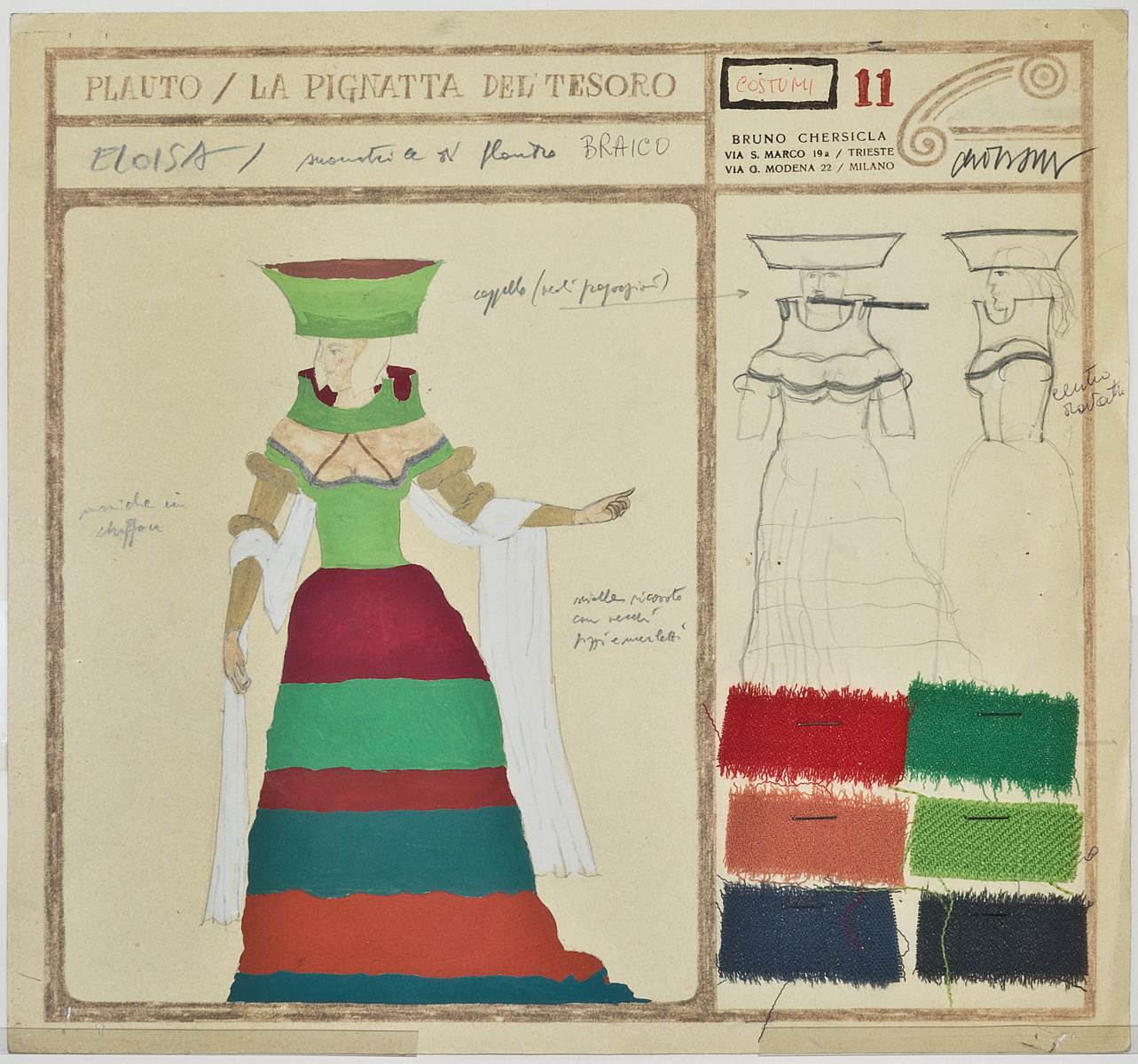 Figurino per Aulularia (La pignatta), testo teatrale di Tito Maccio Plauto (elaborazione di Lino Carpinteri e Mariano Faraguna), regia Ugo Amodeo, Teatro Auditorium e Teatro Romano dal 1 al 28 giugno 1966