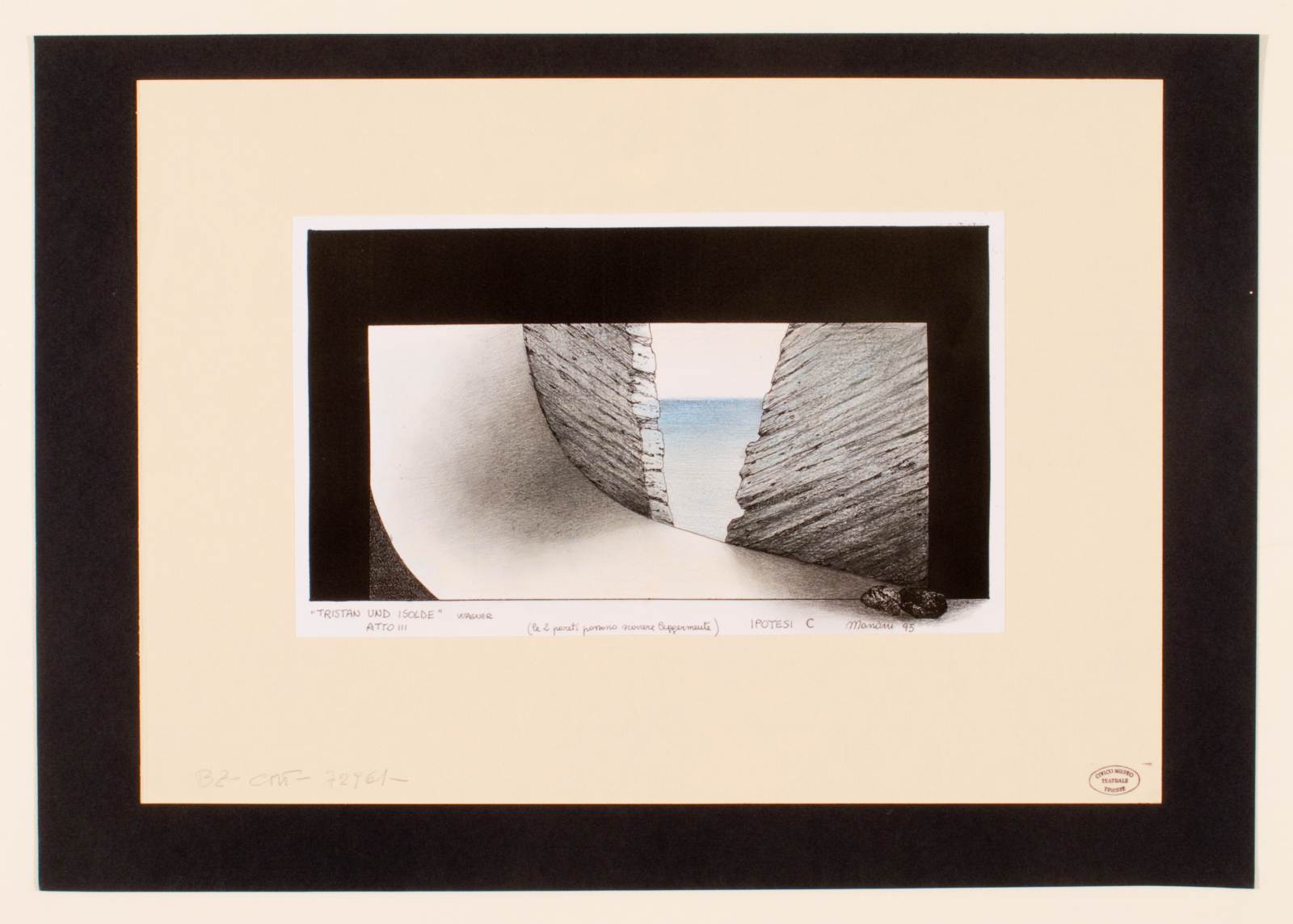 Tristan und Isolde, atto 3. A sinistra striscia continua ad ampia curvatura declinante in basso a destra, al boccascena a destra grande masso isolato, sullo fondo squarcio di orizzonte mare/cielo tra due parete di roccia, boccascena nero unito