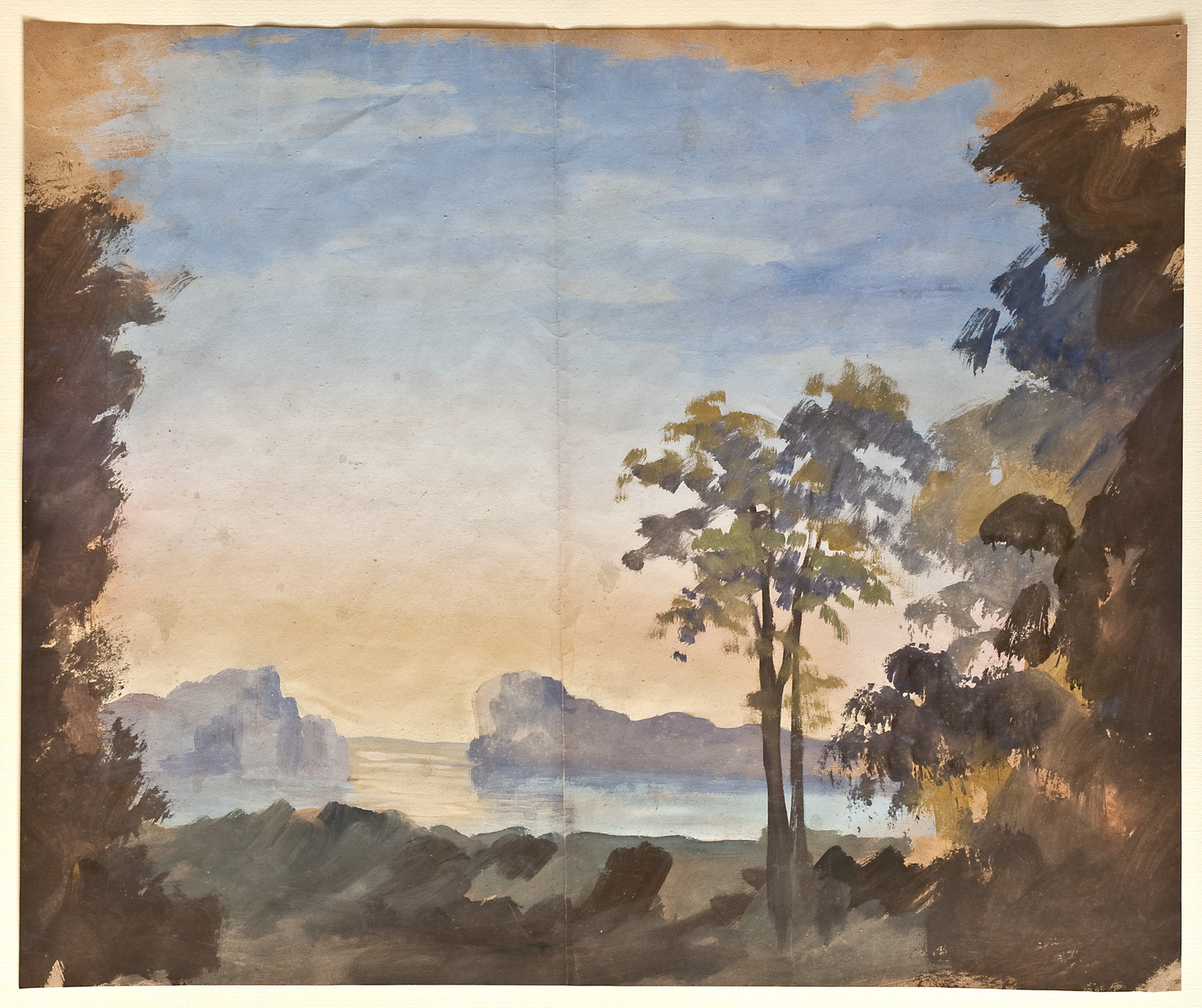 Crepuscolo degli dei (?), opera di Richard Wagner. Esterno, paesaggio lacustre o marino, vegetazione con albero in primo piano e ai lati, scogli affioranti dall'acqua in secondo piano. Luce crepuscolare.