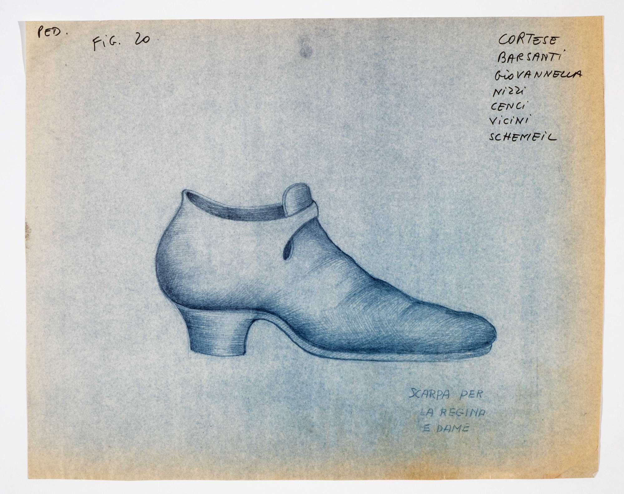 Il gioco dei potenti, libero adattamento di Giorgio Strehler da Enrico VI, dramma storico di William Shakespeare, in 15 atti e 2 giornate. Calzatura con tacco basso e punta larga, di profilo verso destra.