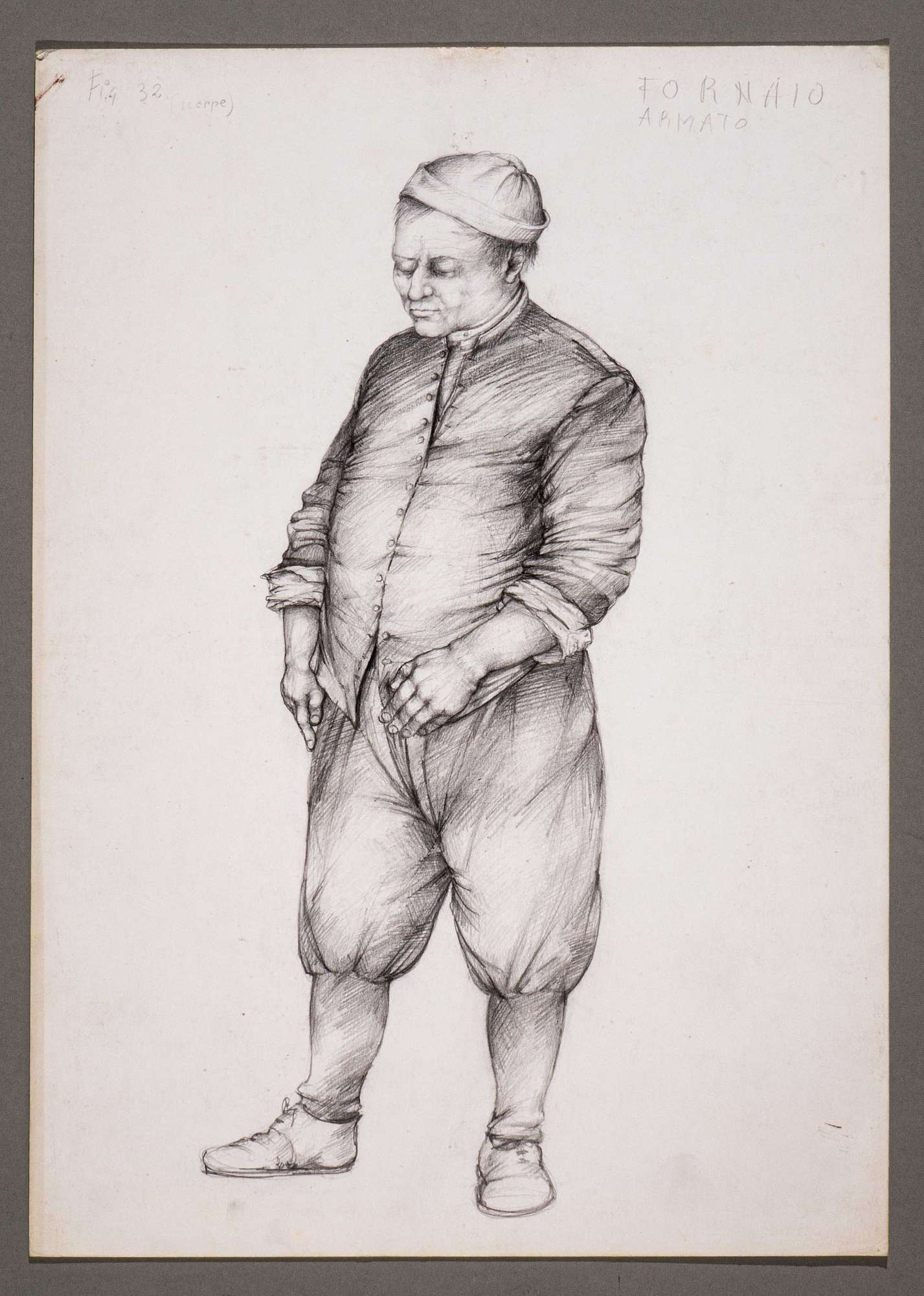Il gioco dei potenti, libero adattamento di Giorgio Strehler da Enrico VI, dramma storico di William Shakespeare, in 15 atti e 2 giornate. Figura maschile in piedi, di tre quarti verso sinistra, con lo sguardo rivolto a terra. Indossa un piccolo copricapo con risvolto, una casacca con le maniche rimboccate, brache alte al ginocchio, calze grosse.