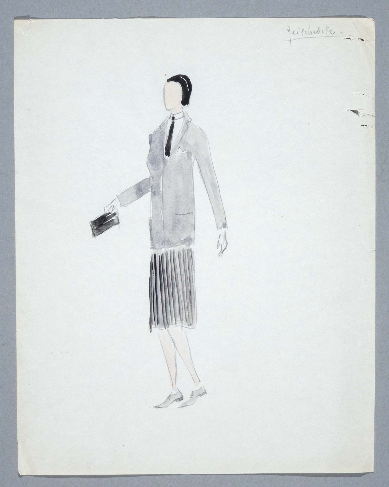 Lulù, opera di Alban Berg. Contessa Geschwitz. figura femminile in piedi, di tre quarti verso sinistra, con copricapo nero. Indossa un completo grigio composto da giacca lunga e gonna plissettata al ginocchi, camicia bianca e cravatta maschile, scarpe basse tipo francesine, Regge una pochette nella mano destra.