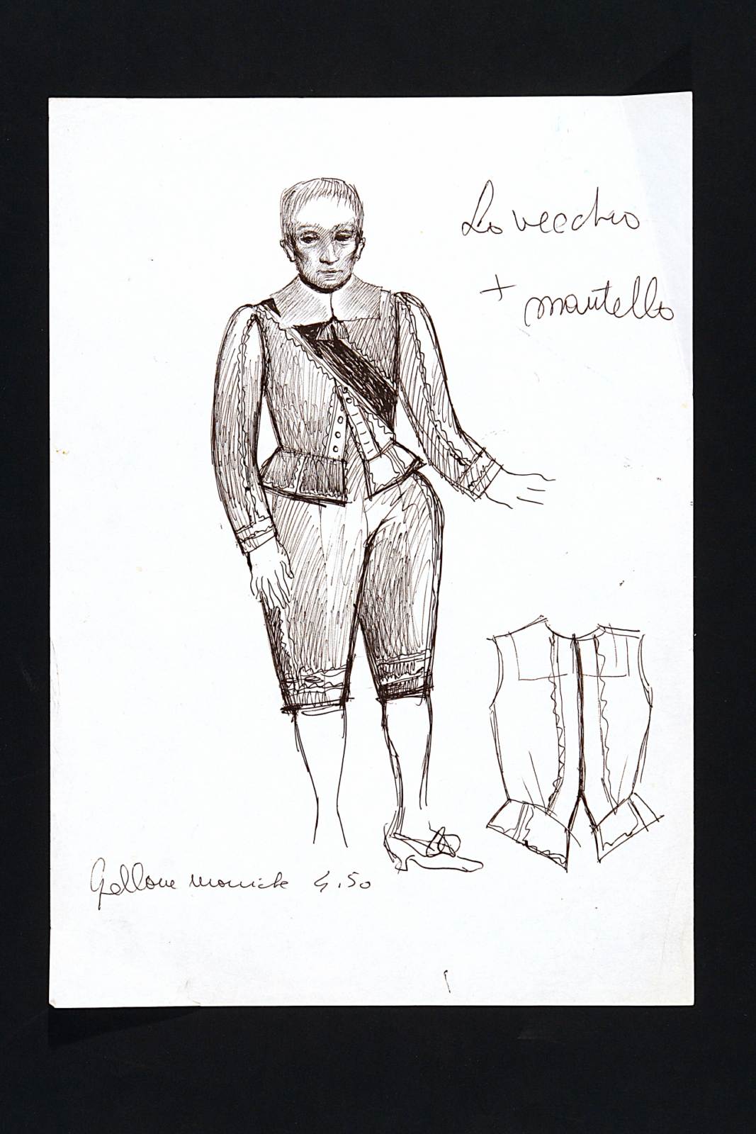 Come vi piace, commedia pastorale di William Shakespeare. Figura maschile intera, di fronte, in abito cinquecentesco, brache e giubba con una fascia a tracolla. Sulla destra schizzo del sotto giacca.