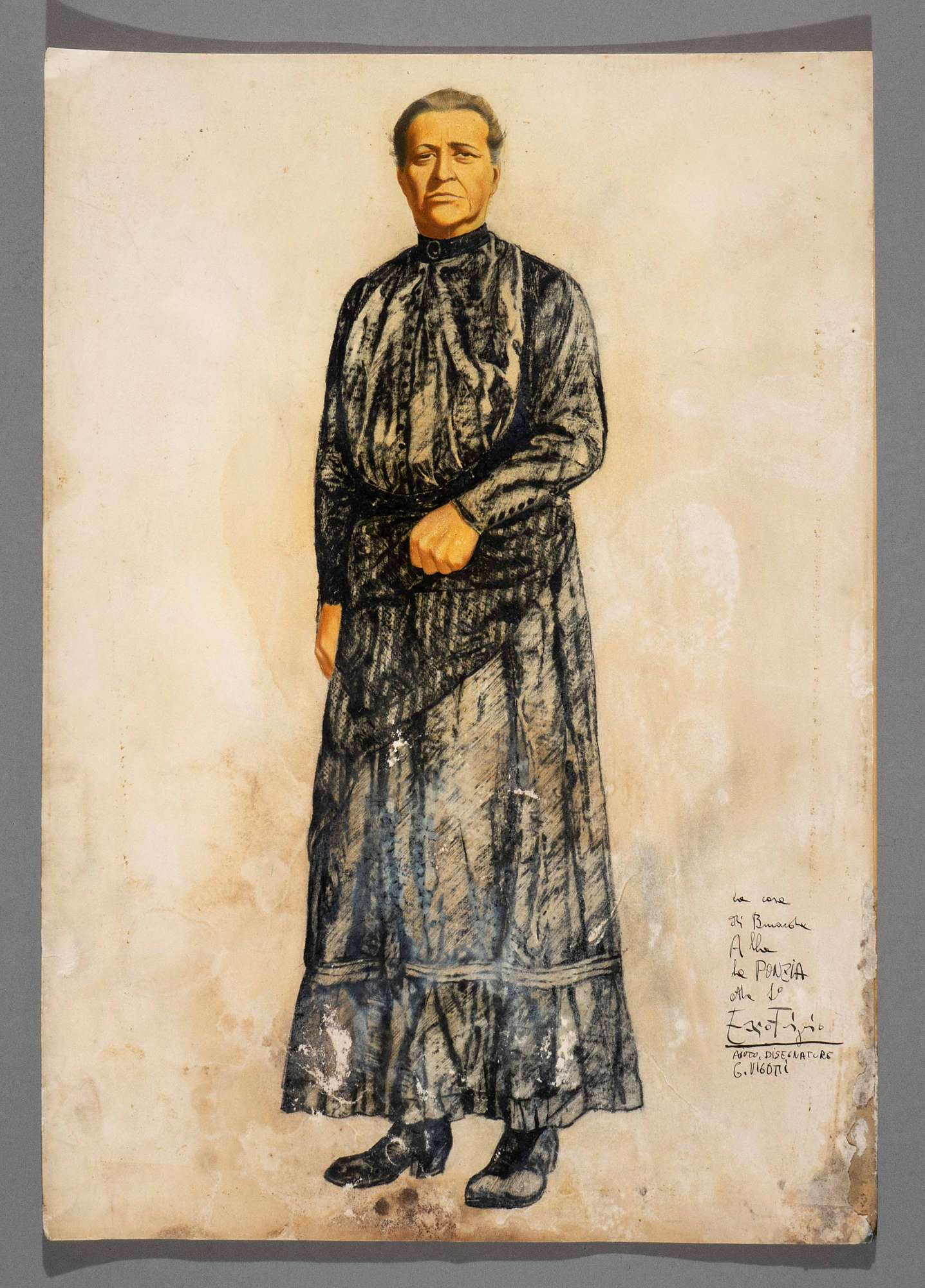 Figurino per il personaggio di Ponzia, vecchia domestica del 1. atto. Figura femminile in piedi di tre quarti verso sinistra, in abito nero sobrio e capo scoperto