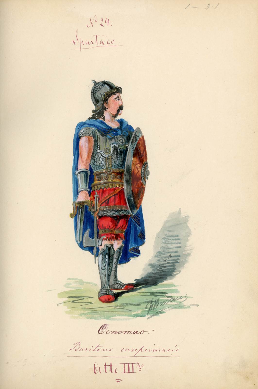 Spartaco, opera di Giuseppe Sinico. Figurino per il personaggio Enomao. Figura maschile intera con il volto di profilo, in abbigliamento militare. Tunica corta e calzoni rossi al ginocchio, corazza a squame, mantello turchese scuro, schinieri, gladio nella mano destra, scudo nella sinistra