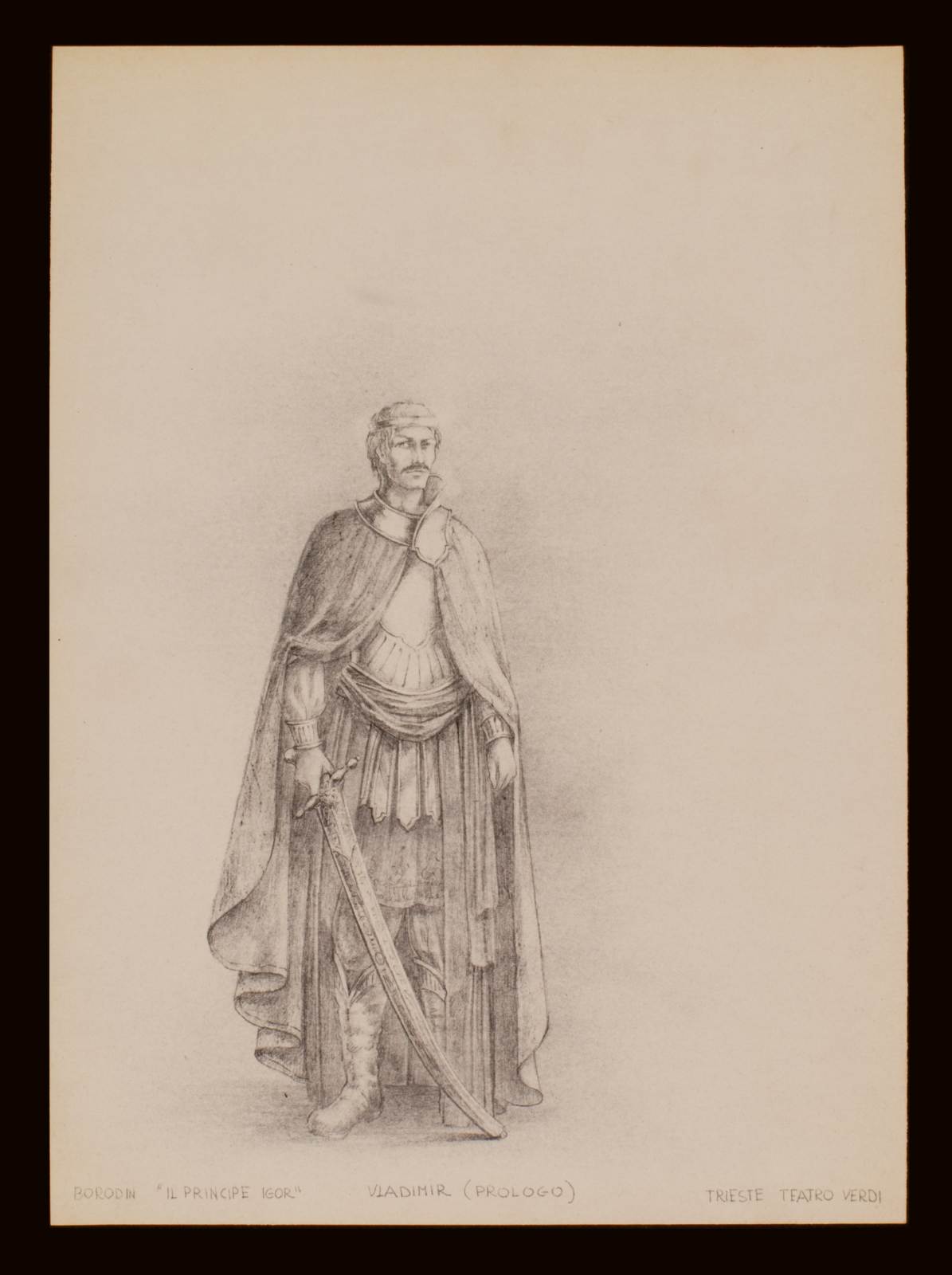 Il principe Igor, opera di Aleksandr Porfir'evič Borodin. Costume per Vladimir. Figura maschile intera. Indossa: corona a fascia, abito al ginocchio, corazza metallica, sopragonna al ginocchio, pantalone, fascia in vita, manto, collare ai polsi in metallo, stivali, con la mano destra regge uno spadone ricurvo che poggia a terra.