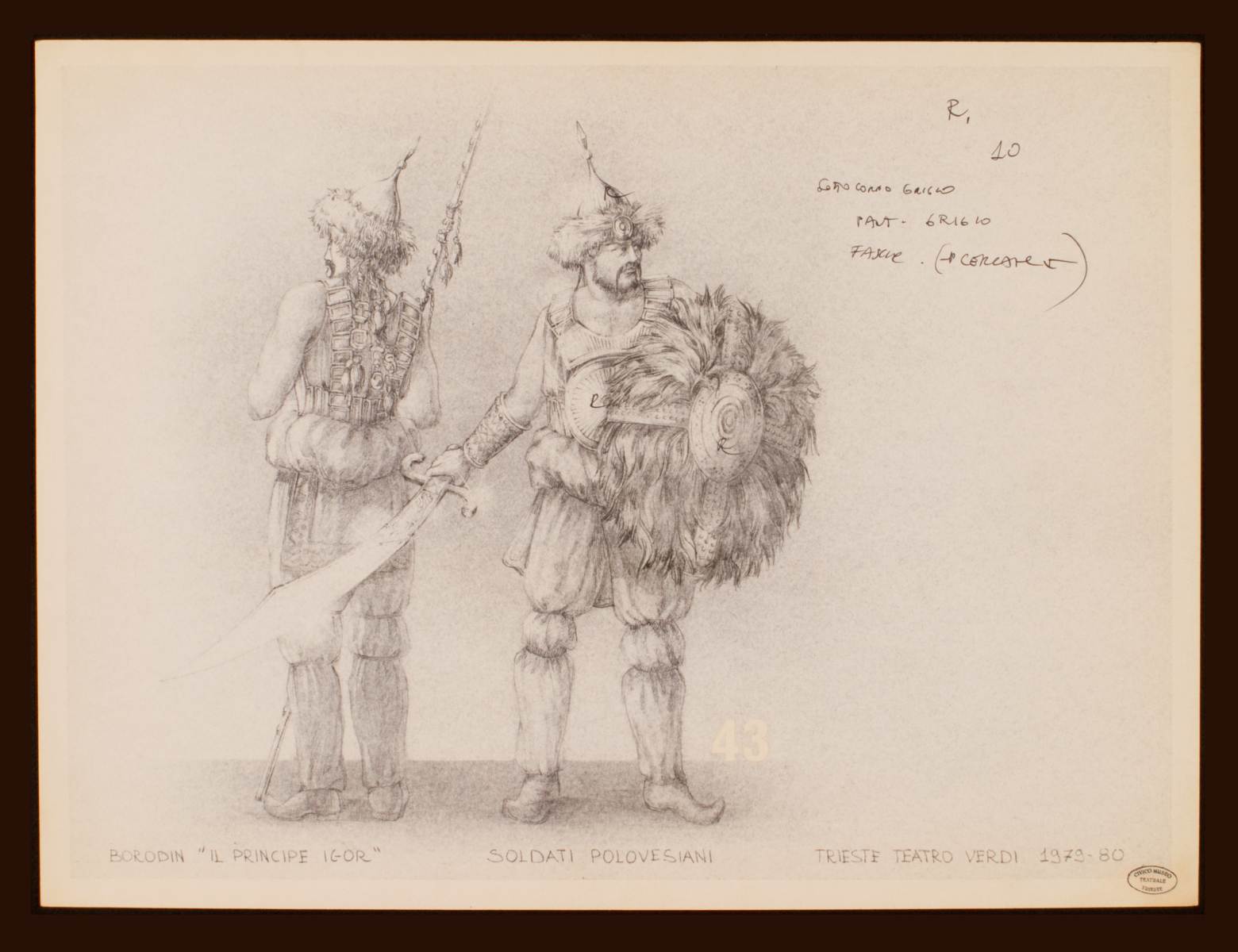 Il principe Igor, opera di Aleksandr Porfir'evič Borodin. Due costumi per soldati polovesiani, due figure maschili intere in piedi. Personaggio di destra: leggermente ruotato verso sinistra, indossa un elmo con puntale bordato di pelliccia e fibbia, blusa sbracciata, corazza a placche, bracciale protettivo, nella mano sinistra scudo con strisce e piastre metallige sovrapposte a copertura di pelliccia, pantalone con legature, scarpe a punte ritorte, scimitarra nella mano destra. iIgura di sinistra di schiena abbigliata come la precedente, reca una lancia nella mano destra