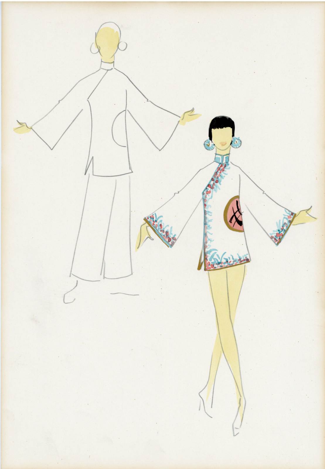 Cin-Ci-Là, operetta di Virgilio Ranzato, Figurino per costume femminile cinese, ambientazione Macao 1925. Casacca accollata a chiusura laterale con decori e grafismi e motivi floreali. Maniche larghe ai polso. Colori: bianco, rosa, azzurro, oro. In alto a sinistra schizzo a matita del medesimo costume completo di pantalone largo alla caviglia