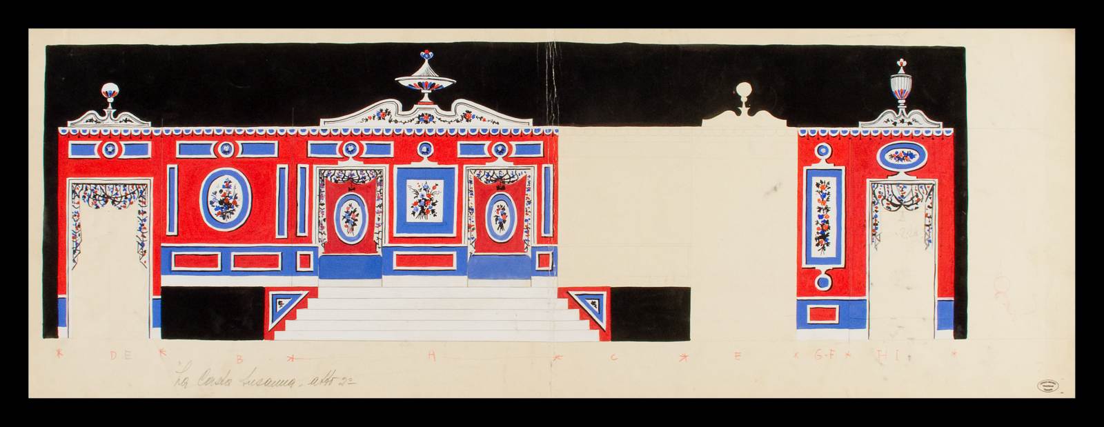 La casta Susanna di Jean Gilber, 2. atto, Moulin Rouge, interno del locale con sfondo del muro, scalinata centrale a 5 gradini, stucchi e cornici di gusto geometrico e floreale, drappi a fiorami