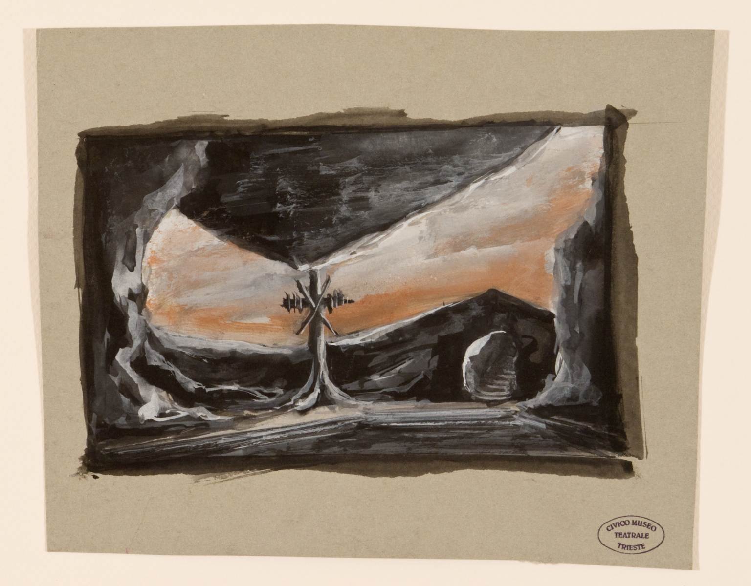 Suor Angelica, atto unico di Giacomo Puccini. Cortile di convento in atmosfera cupa e notturna. Al centro croce latina. Ai bordi pareti rocciose, verso il fondo struttura muraria e sullo sfondo montagne.