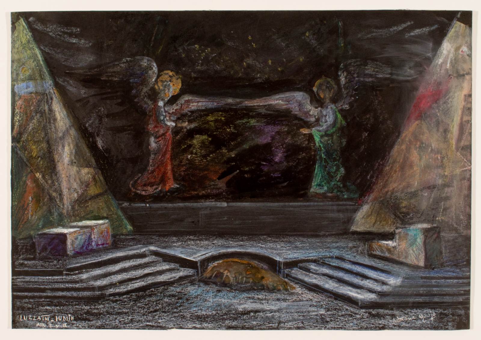 Judith, dramma biblico di Livio Luzzatto, atto 1., scena 2. Tenda di Judith e accampamento di due tende ai lati. Sul fondo cielo notturno e due angeli