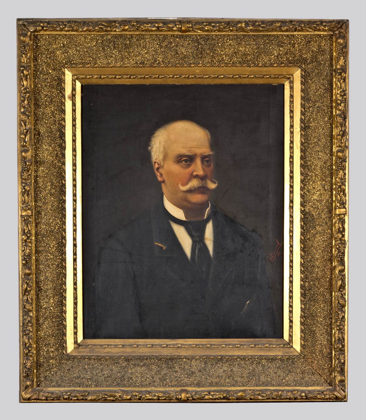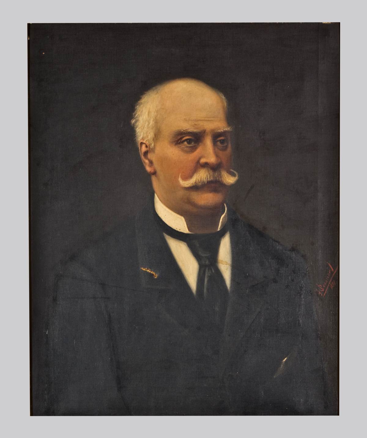 Ritratto di Edoardo Borghi ripreso a mezzobusto di fronte, leggermente ruotato verso destra. Il commerciante viene ritratto in età avanzata, porta capelli e baffi bianchi. Indossa: camicia bianca con colletto alto, cravatta nera al collo, giacca nera abbottonata