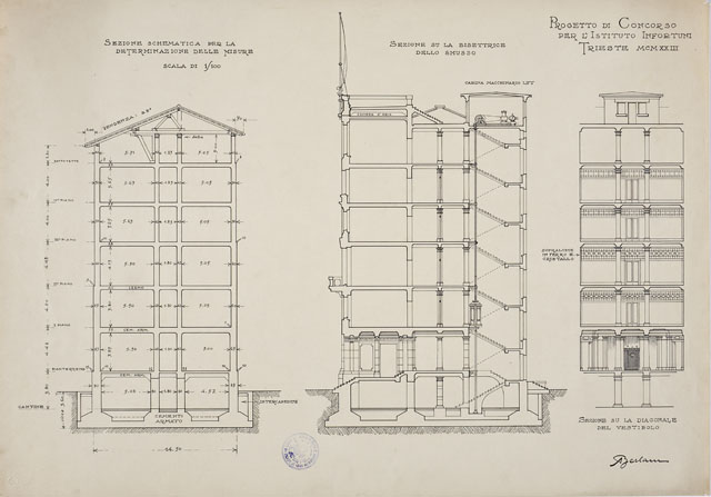 Si tratta di uno dei disegni della serie "Progetto per la costruzione della sede dell'Istituto Nazionale d'Assicurazione per gli Infortuni sul Lavoro in via Coroneo" eseguiti da Arduino Berlam, cfr. schede CMSAOAR10_4245 - CMSAOAR10_4271. Nel dicembre 1922 Arduino Berlam venne invitato a partecipare al concorso per la sede dell'Istituto Nazionale d'Assicurazione per gli Infortuni sul Lavoro, che sarebbe stata realizzata in via Coroneo a Trieste. Egli presentò la sua proposta il 14 marzo 1923, che non venne selezionata: fu preferito il progetto degli architetti Enrico e Umberto Nordio. La tavola illustra la sezione trasversale, quella sulla bisettrice dello smusso e la sezione sulla diagonale del vestibolo.