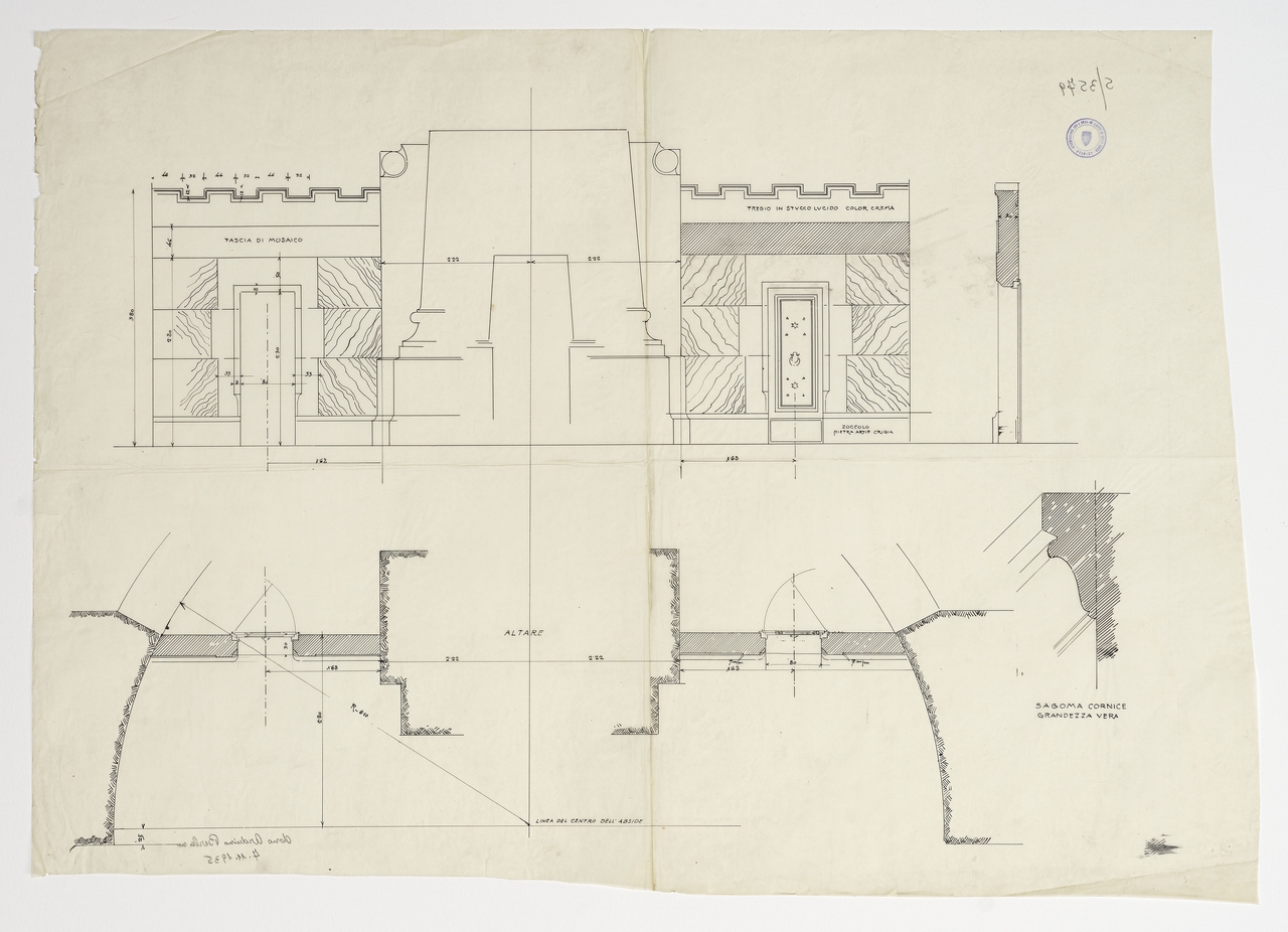 Progetto per la Sinagoga di Trieste con particolari, sezione posteriore e indicazioni tecniche.