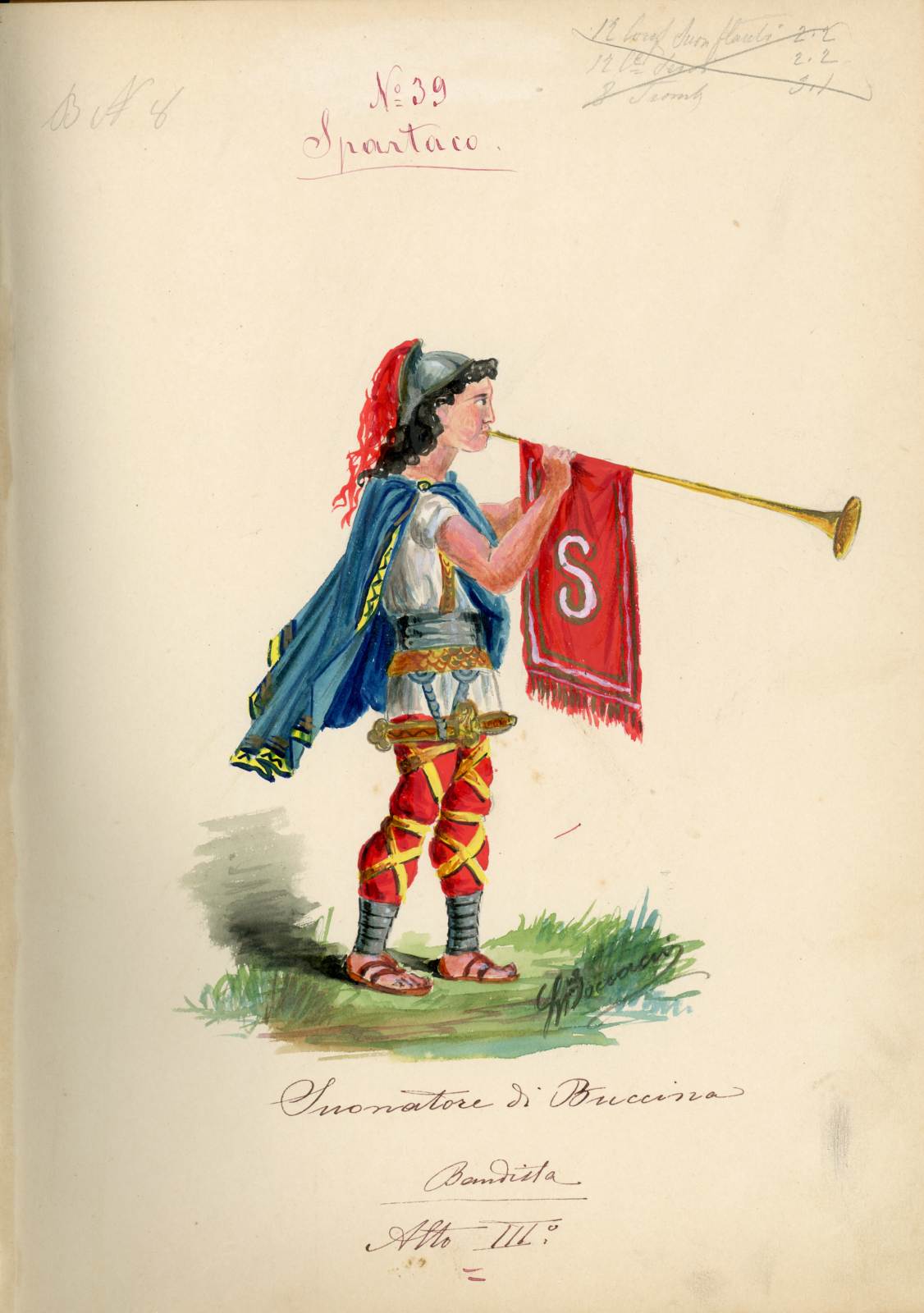 Spartaco, opera di Giuseppe Sinico. Figurino per il personaggio di un suonatore di buccina. Figura maschile intera di profilo in abbigliamento militare, suona una buccina con insegna rossa marcata S. Corta tunica bianca, gambe fasciate di giallo e rosso, mantello blu, elmo con pennacchio, gladio al fianco